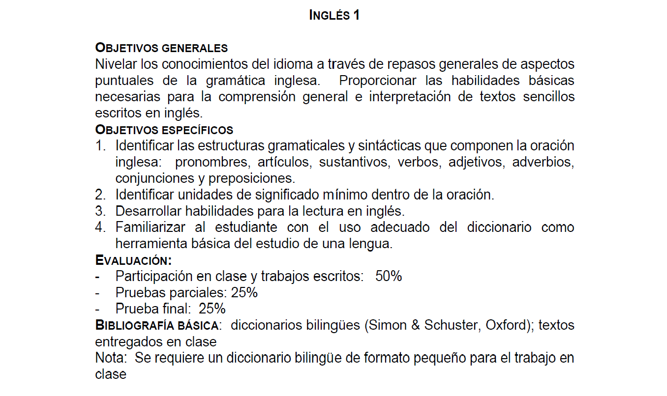 Este curso tiene como objetivo nivelar los conocimientos del idioma a través de repasos generales de aspectos puntuales de la gramática inglesa. Asimismo, proporciona un espacio para fomentar el desarrollo de las habilidades básicas necesarias para la comprensión general e interpretación de textos sencillos escritos en inglés.